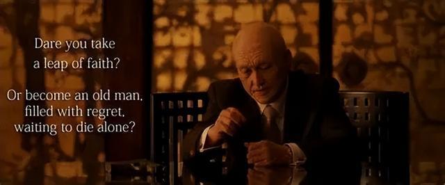 台词:So do you want to take a leap of faith or become an old man, filled with regret, waiting to die alone?(那么,你是想放手一搏,还是要等到年华老去,心中充满遗憾,孤独地迈向黄泉路?)