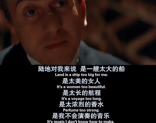 台词:Land is a ship too big for me. It's a woman too beautiful; it's a voyage too long, a perfume too strong. It's a music I don't know how to make.(陆地对我来说是一艘太大的船,是太美的女人,是太长的旅行,是太浓烈的香水,是我不会演奏的音乐)
