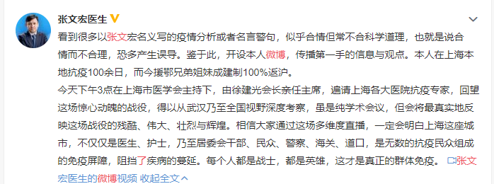 看到很多以张文宏名义写的疫情分析或者名言警句,似乎合情但常不合科学道理,也就是说合情而不合理,恐多产生误导。鉴于此,开设本人微博,传播第一手的信息与观点。本人在上海本地抗疫100余日,而今援鄂兄弟姐妹成建制100%返沪。