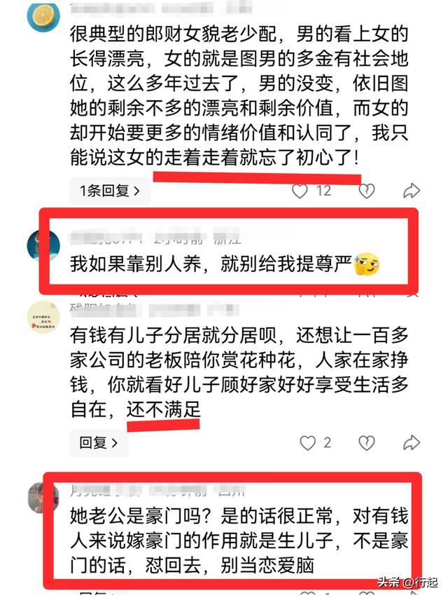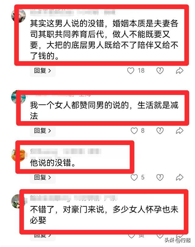 但是意外的,网络上的舆论,很多网友却都是站在了路行这一边:“我一个女的都赞同男的说的”,“做人不能既要又要,大把底层男人既给不了陪伴又给不了钱”;“不错了,对豪门来说,多少女人怀孕未必娶”。