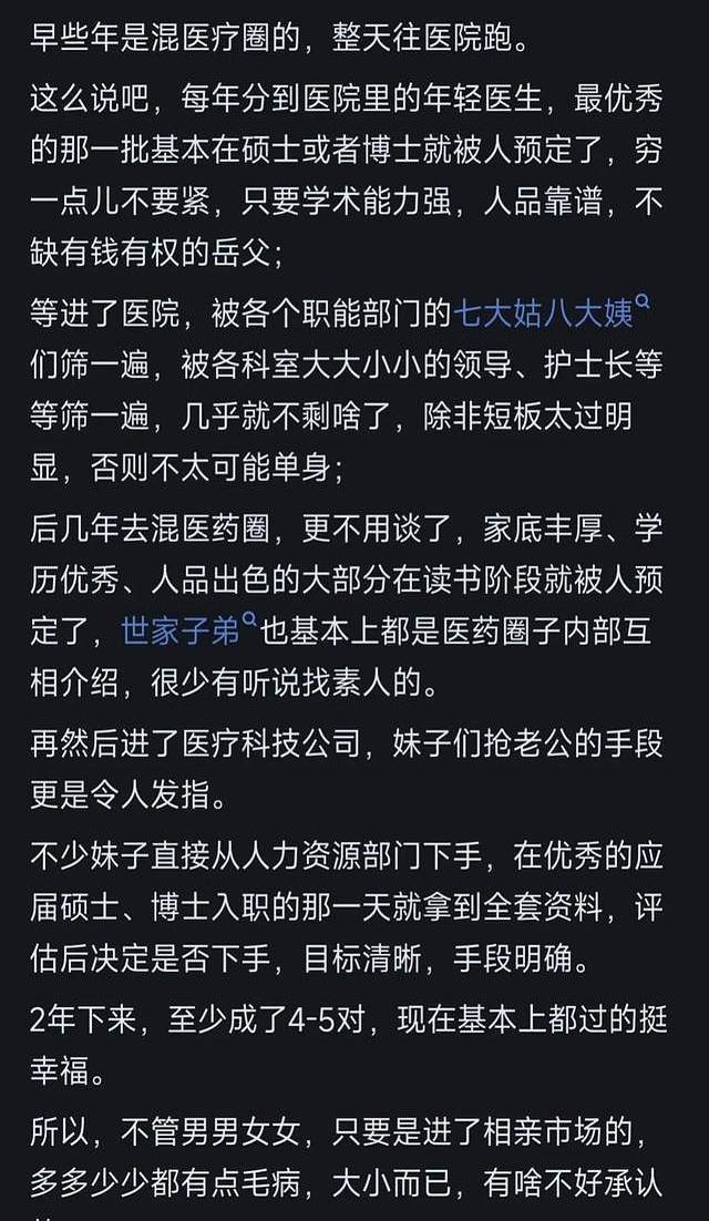 网友@碎碎念说:我妈就是县医院护士,她们内部圈子比相亲网站还快,谁家有条件男孩马上就被推荐介绍,外面都捞不到。