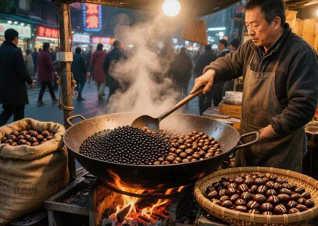 找“黑砂栗子”流动摊,10元买“城市胎记”,先闻烟,再剥壳,热粉入口,记忆“重启”,明天继续搬砖。
