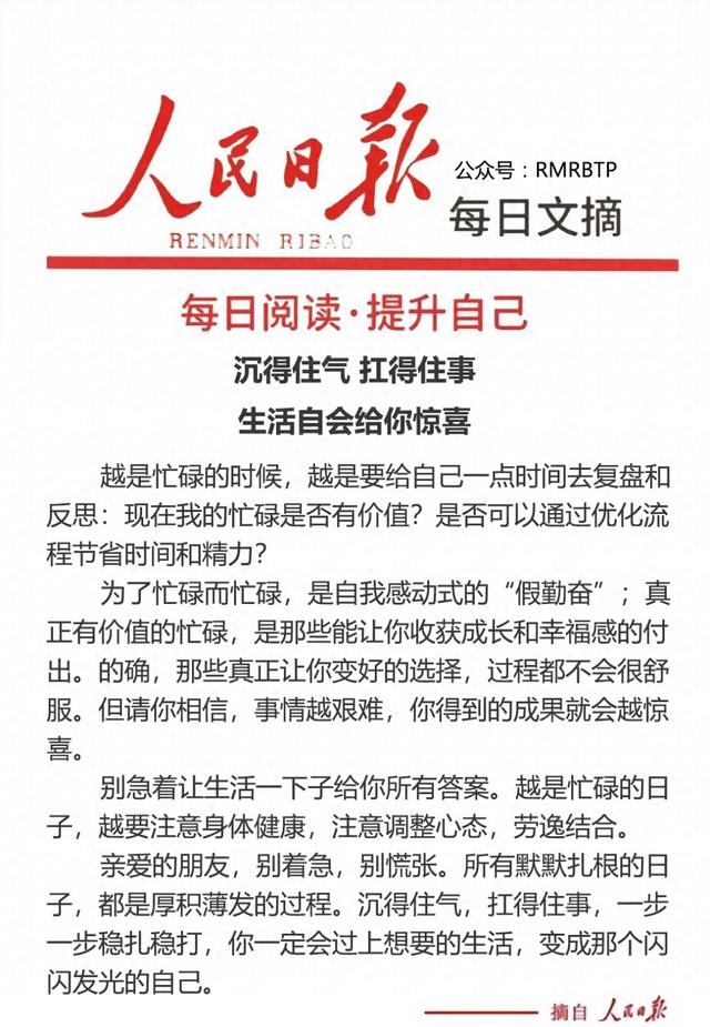 总之,沉住气是清醒,扛住事是勇气,稳扎稳打是智慧。不浮躁、不退缩、不慌张,在默默耕耘中积蓄力量,在艰难挑战中突破自我,生活终会以惊喜回应你的坚持。那些闪闪发光的时刻,从来都属于那些能沉下心、扛住事、一步步踏实前行的人。