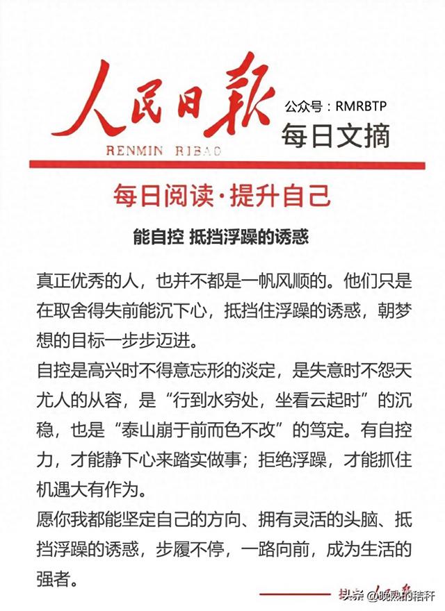 有自控力,才能在纷繁世事中守住内心的节奏,不被浮躁带偏方向;能拒绝急功近利的诱惑,才能沉下心打磨实力,在机遇来临时稳稳抓住。正如水流唯有收束住奔腾的势头,才能汇聚成深潭;人唯有掌控住自己的情绪与欲望,方能行稳致远,在人生路上有所作为。