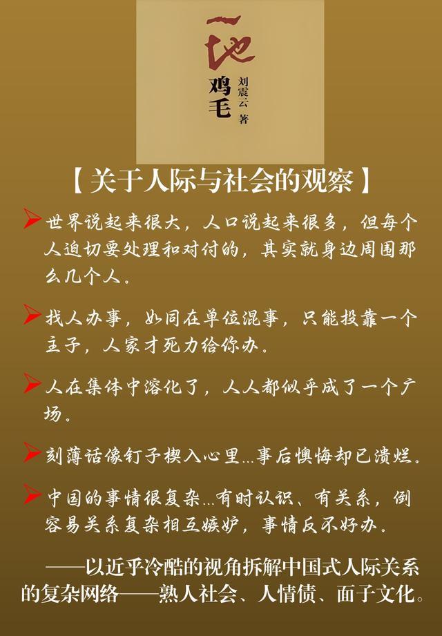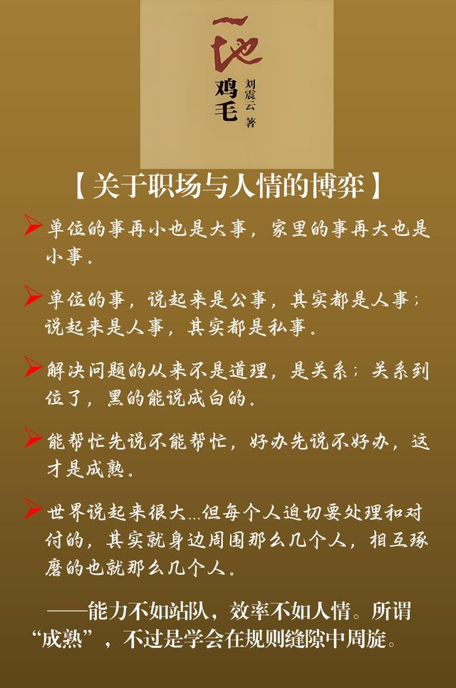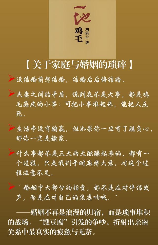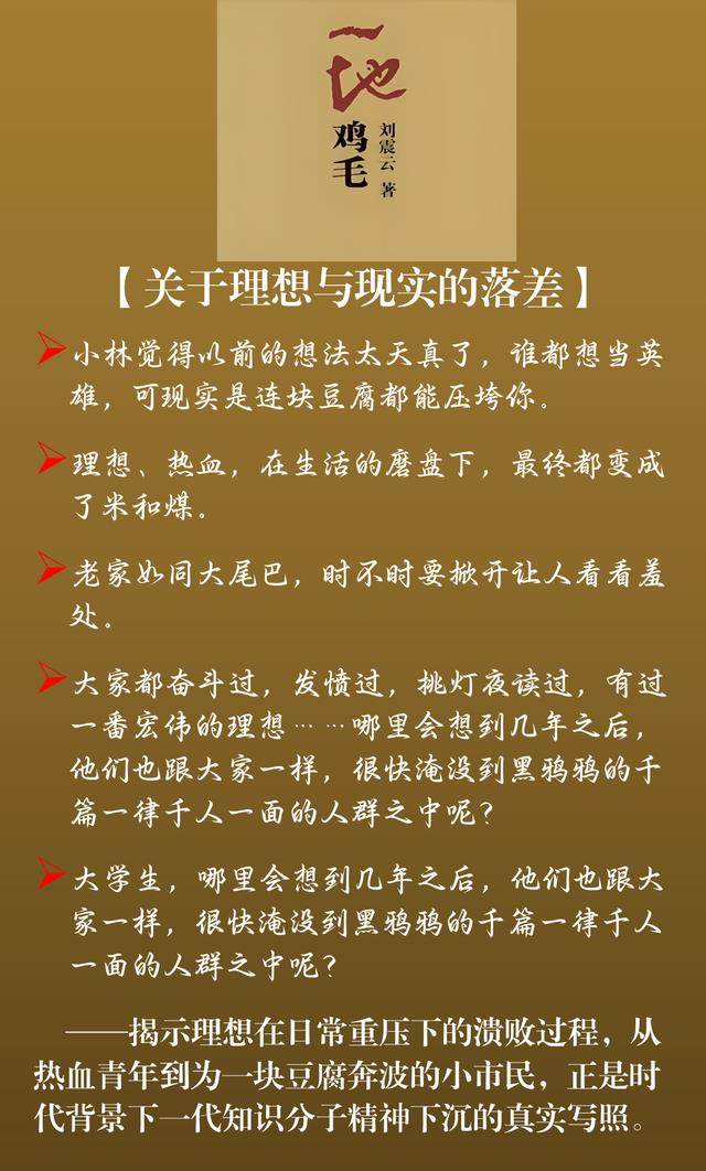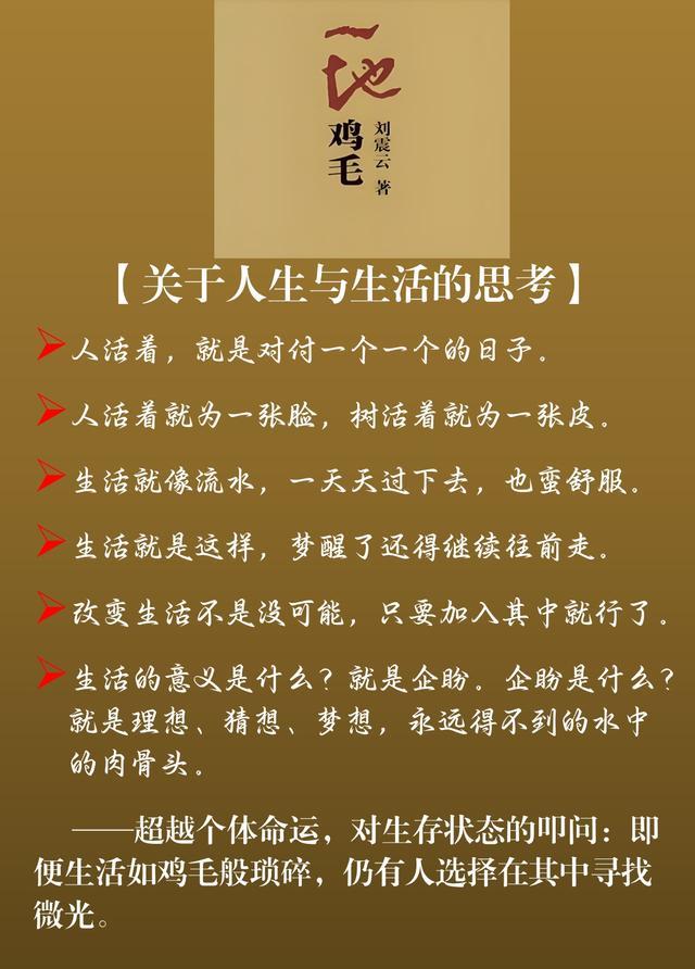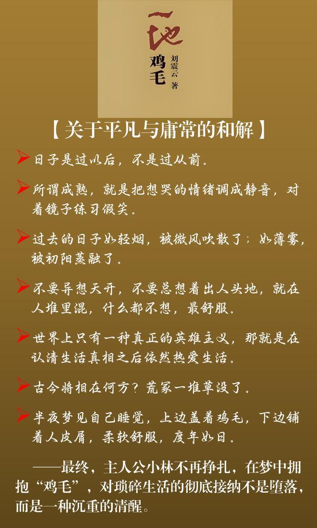 《一地鸡毛》描写了20世纪80年代末90年代初一个小职员平庸琐碎且窘迫的生存状态。刘震云以不动声色的幽默真实地表现小人物的生活,以冷静笔触描绘普通人被生活琐事层层围困的精神图景,以朴实无华的语言展示普通人的普通生活。