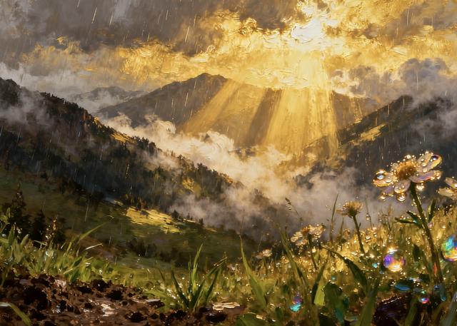 雨后的山巅,空气清新,带着泥土与青草的芬芳。云雾在山谷间缭绕,阳光穿透云层,洒下金色光柱,照亮山间野花,花瓣上的水珠折射出七彩光芒。