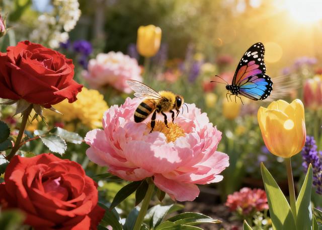 春日庭院生机勃勃。迎春花金黄挂枝,海棠、桃花竞放,娇艳欲滴。蜜蜂忙碌,蝴蝶起舞,春意盎然。