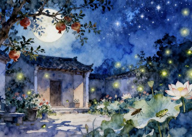 庭院浸在淡淡的月光里,石榴树的影子被拉得很长。萤火虫提着灯笼在花丛间穿梭,忽明忽暗的光点与天边星光交相辉映。晚风送来荷花的清香,蝉鸣与蛙声交织成自然的夜曲。