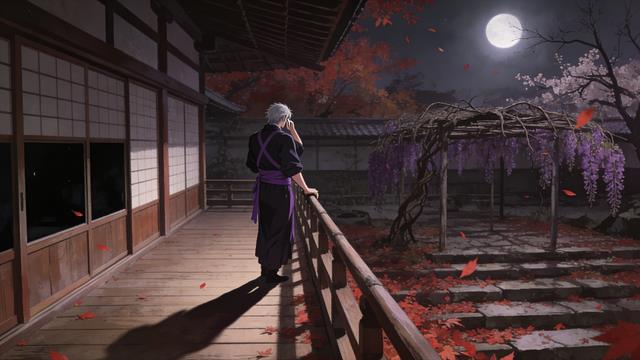 紫姬离世后,源氏公子独居六条院,院中樱花依旧,紫藤如瀑,却再无一人为其簪花,为其添茶,为其解语。是夜,月色如昔,公子凭栏而立,望向紫姬昔日居所,窗下无灯,阶前无影,唯有秋风萧瑟,吹落满阶红叶。忆及紫姬一生温柔,相伴数十载,从垂髫稚童到温婉夫人,一路相守,竟终是别离,公子泪落沾衣,心下暗想:“此生繁华,皆因有你,你若离去,这六院繁华,不过是一片空寂。”