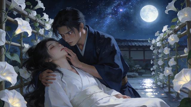 是夜月色清朗,银河耿耿,源氏与夕颜同坐于夕颜花架下,花香袭人,夜色温柔。夕颜着素白单衣,倚着公子肩头,轻言细语,诉平生孤苦,公子怜之,执其手曰:“此后有我,必不负你。” 夕颜浅笑,眼波如月下秋水,正欲言语,忽觉心口剧痛,面色骤白,倒于公子怀中。公子大惊,急唤左右,然夕颜气息渐微,终在月色与花香中,香消玉殒,唯余满架夕颜花,在夜风中轻轻摇曳,宛若垂泪。