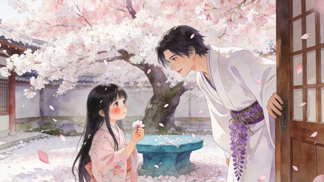源氏公子自北山归,途经一户人家,见院中樱花满树,开得烂漫,随风飘飞,落英如雪。忽闻院内有稚童笑语,推门窥之,见一女童年方六岁,着浅粉色小十二单,发垂及腰,眉目如画,眼波流转,宛若春日枝头初绽的樱花,清丽绝尘。公子惊为天人,心下暗想:“此女眉目,竟与藤壶中宫一般无二,莫非是天造地设的缘分?” 遂上前轻唤,女童怯生生抬眸,望公子一眼,低头捻弄樱花,粉颊微红,更添娇憨。