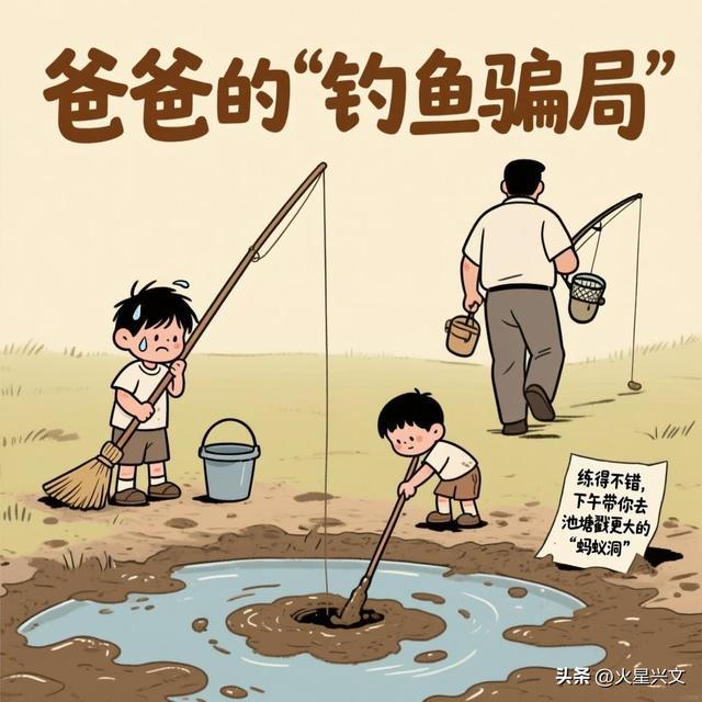 小时候我爸总说带我去钓鱼,每次都让我先在家 “练习甩竿”—— 其实就是让我拿着拖把杆在院子里戳蚂蚁洞。等我戳得满头大汗跑进屋,发现他早揣着渔具溜了,桌上留张纸条:“练得不错,下午带你去池塘戳更大的‘蚂蚁洞’。” 我信了,结果那天戳了一下午泥巴。