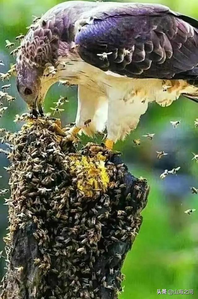 14.任凭蜜蜂们如何反抗,都对这位正在大快朵颐的入侵者无可奈何。究其原因,还是蜂鹰那一身厚实的羽毛和覆盖着坚硬鳞片的双腿,简直就是专门为抢劫蜂蜜而生的无敌装备。