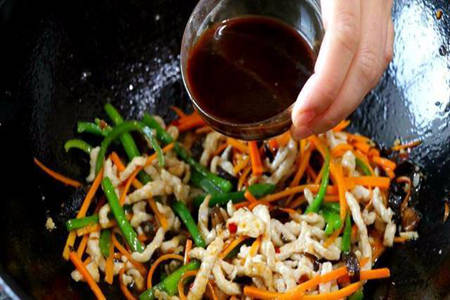 制作步骤:1、处理好材料一直都是第一步,这是不能够省却的。这里我们要做的是先将配料准备好,将生抽、白糖、醋、料酒,合适的盐以及淀粉加入到一个小碗当中,然后稍微的将它们搅拌开来,调成鱼香汁,这也就是为什么这道菜没有鱼却叫鱼香肉丝了。其他的青椒、木耳、胡萝卜切成适合的大小。