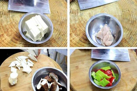 制作步骤:1、将豆腐切成块状、里脊肉切片,其他的材料配料等也都切成合适的大小放在一旁备用。