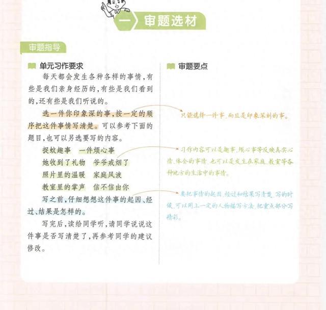 我们先来看一下要求:选一件你印象深的事,按一定的顺序把这件事情写清楚。这就要求你要选择印象深刻的事情,写事情的时候还要有一定的顺序。一般来说,我们写事,需要把事情的起因、经过和结果写清楚。