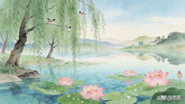 21. 《山寺秋霁》·张仲素:水落溪流浅浅,寺秋山霭苍苍。树色尤含残雨,钟声远带斜阳。顿悟:雨后山寺的清寂,能洗涤内心的浮躁。