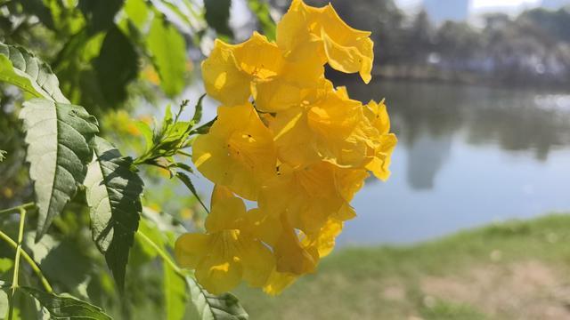 注:冬日,在泰国曼谷大皇宫边上的卧佛寺门外偶遇黄钟花,绽满枝头,花灿如金……