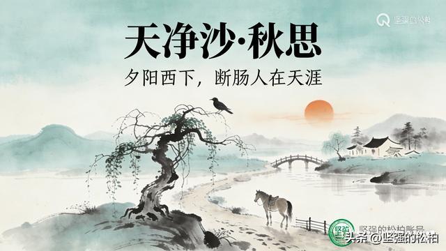 枯藤、老树、昏鸦,小桥、流水、人家,古道、西风、瘦马,九个意象,勾勒出一幅秋日黄昏图。最后一句,直戳人心,道出了无数异乡人的心声。