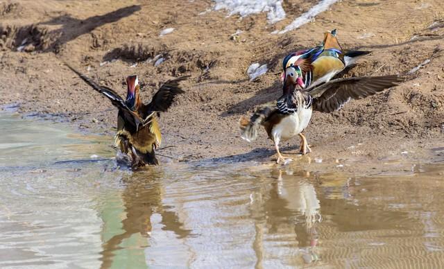 后两句:泥土融化,燕子忙着衔泥筑巢,翩跹飞舞;沙滩温暖,鸳鸯相互依偎,静静安睡,动态与静态相映,充满温柔的生机。
