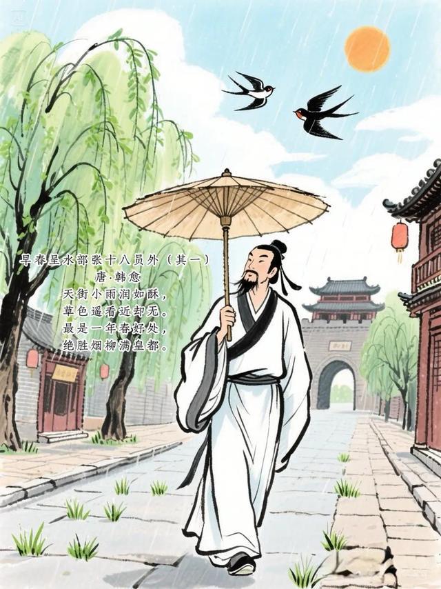 若论早春之美,韩愈的《早春呈水部张十八员外》则独步千古。长安街上,细雨如酥,滋润万物,远看草色淡淡如烟,近看却又似有若无。诗人叹道,这朦胧清淡的早春,远胜暮春时节烟柳满城的浓艳。这份对“浅淡之美”的偏爱,道尽了春游最动人的初心——不必繁华,只需初见春痕,便满心欢喜。