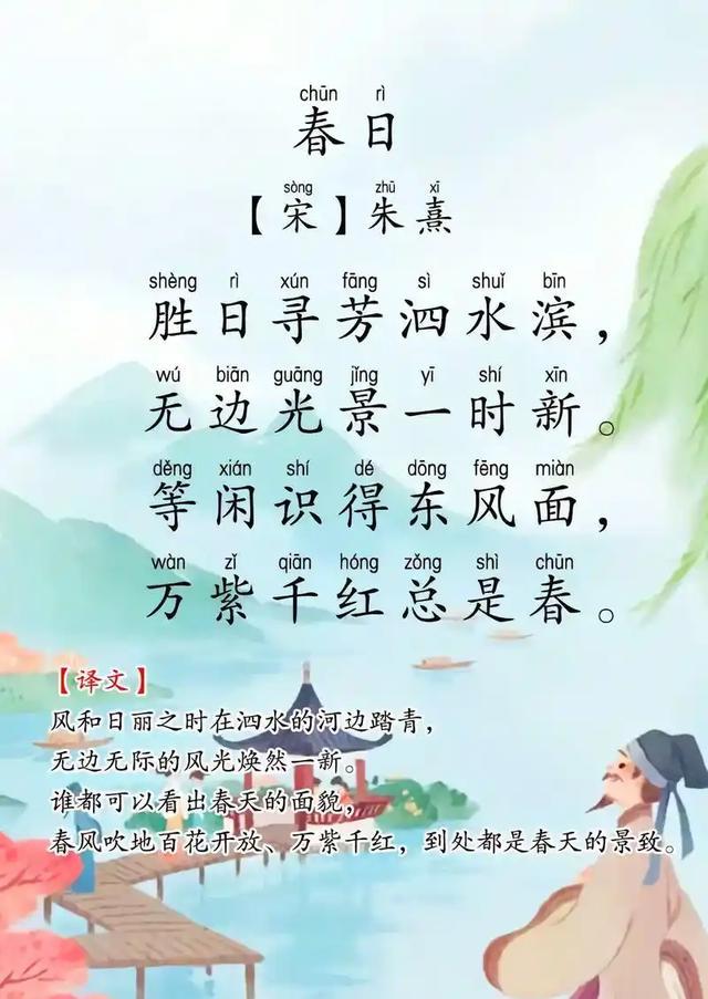 朱熹的《春日》,则把春游写得通透又开阔。“胜日寻芳泗水滨,无边光景一时新”,晴日里寻春,天地间万物焕然一新。“等闲识得东风面,万紫千红总是春”,春风拂过,百花齐放,人间处处皆是春光。这首诗不只是写春游,更写心境,告诉世人,春光不在远方,而在心怀热爱的眼中。