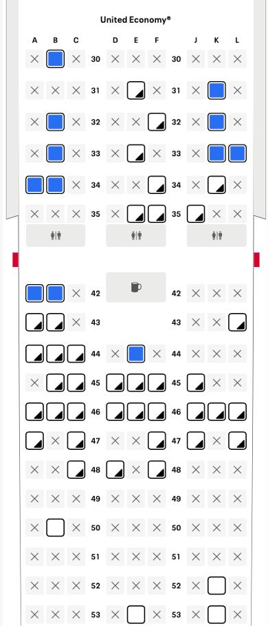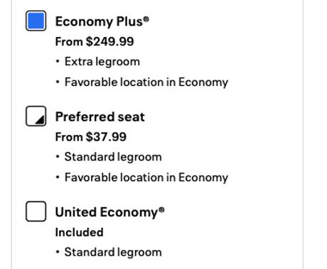以美联航为例,其经济舱座位有三种:plus座位、偏好座位、普通座位。其中plus版说是比普通经济舱的腿部空间要大一点,但这种大往往只体现在数值上。而偏好座位则和本文主角线上付费选座一样,只是能花钱让你选择想要的特定座位。至于普通座位,就在没人想选的客舱后方。
