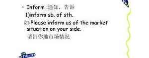 一、inform的用法和短语?1/inform释义:vt. 通知;告诉;报告vi. 告发;告密2/inform的用法例句:If there are any changes, please feel free to inform us.如果有任何变动,请随时通知我们。3/inform的短语有:in ...