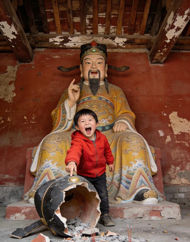 大人都慌了神,偏偏一个小男孩奶声奶气地喊:“妈妈快看,财神爷给自己磕响头!