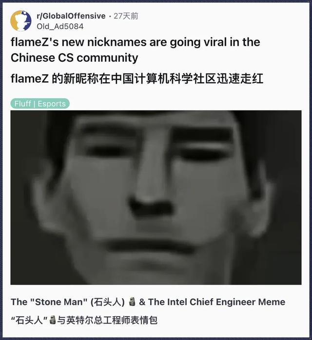 内容讲的是“石头人/摩艾石像”,一个与CS职业选手flameZ(火仔)看似毫不相关的新绰号,在中文CS社区迅速走红的事情。
