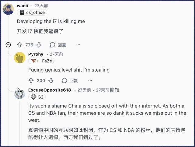 还有人感慨:“真遗憾中国的互联网如此封闭。作为同时关注CS和NBA的粉丝,他们的表情包真的太会玩了,我们西方错过了太多乐子。”
