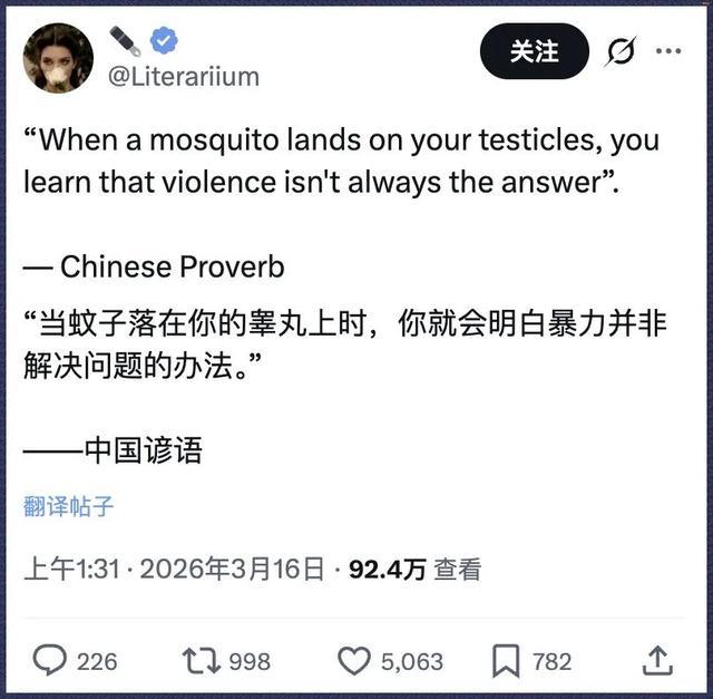 当然,这个成语是我现编的,原句其实是“当蚊子落在你的睾丸上时,你就会明白暴力并非解决问题的办法”——有点类似投鼠忌器的“信达雅”版本,抽象中又带着点道理。
