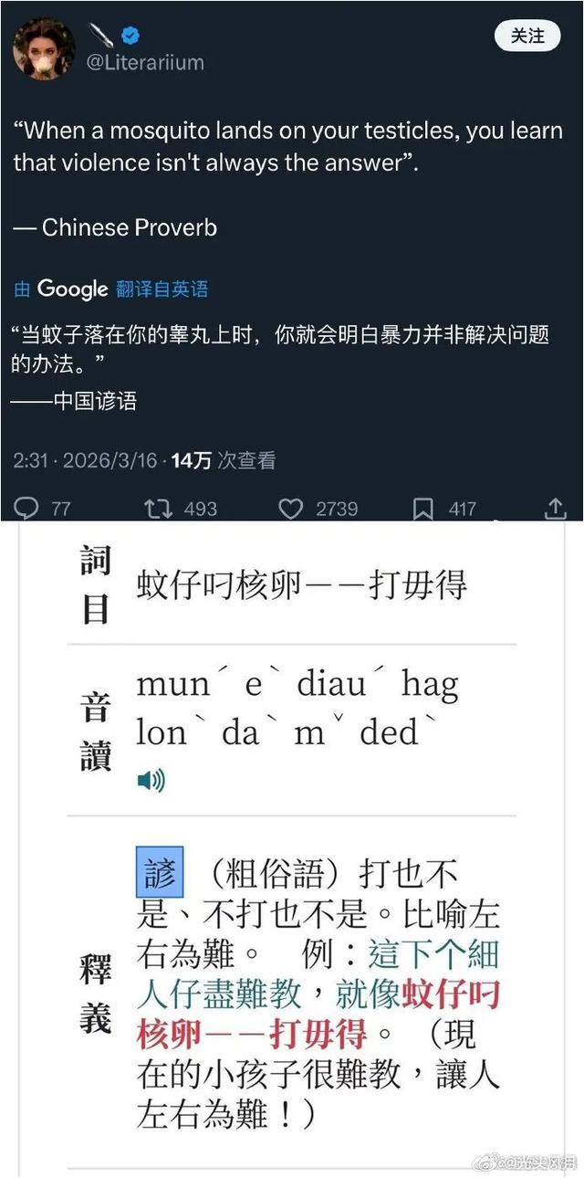 事情是这样的,前段时间X上有一条“中国谚语”挺火的,叫“拍蚊蛋疼”。