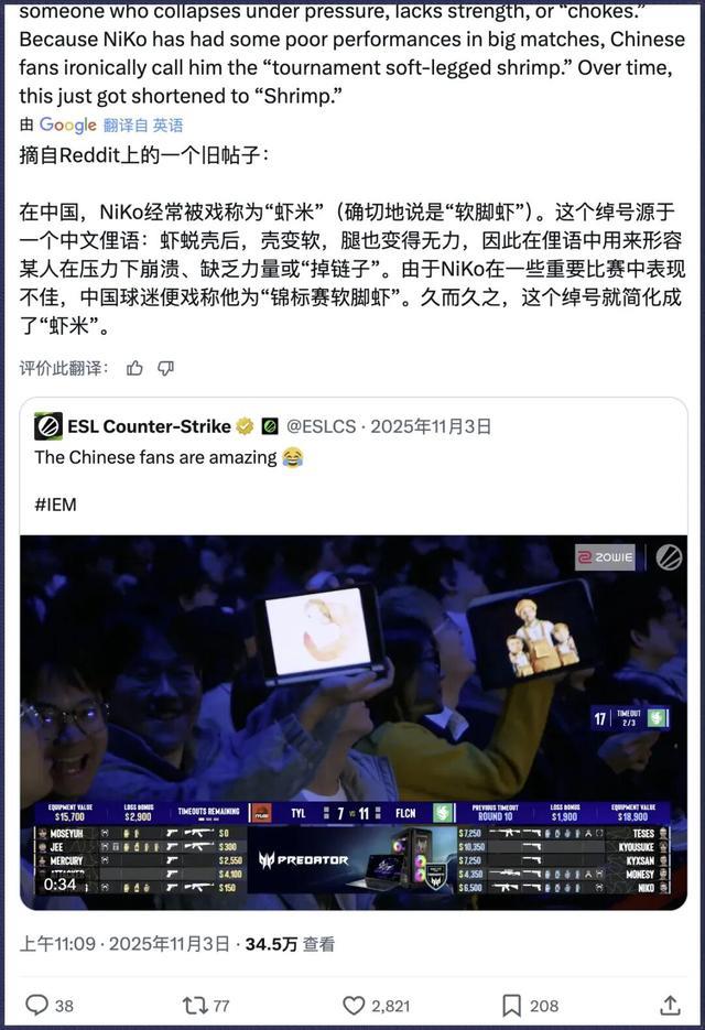 这个梗早已在海外社区流传开来。每次一有Niko的比赛,总能看到现场观众举着“虾哥”的粉丝牌子,接着解说开始给观众讲解梗,场面相当欢乐。