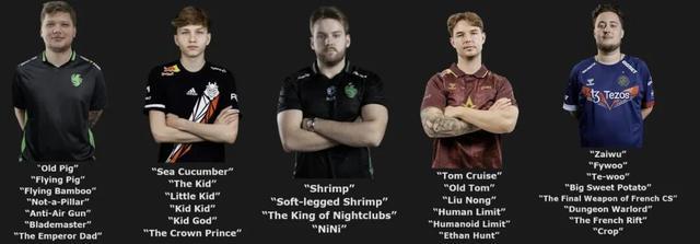 老猪s1mple、小孩/孩神/海参m0NESY、虾哥/尼尼Niko、老汤/人类极限/类人极限device、载物/大番薯/法国最终兵器ZywOo……