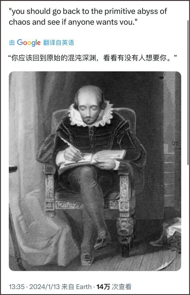 实际上,不只是游戏台词。很多中文骂人话经过机翻以后,看起来跟莎士比亚写诗一样,吐槽往往也特别的有诗意和戏剧性,读起来简直是一种享受。