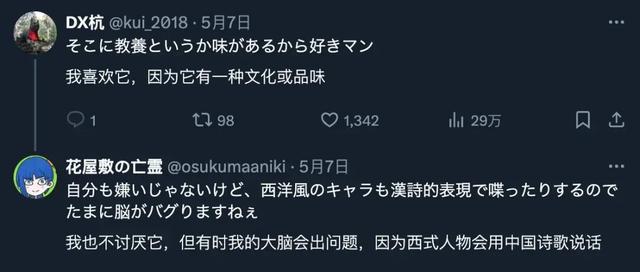 原推补充道,自己也不是特别讨厌这种现象,但是看到某些西洋风的角色突然用文绉绉的调调讲起“汉诗”,有时大脑会突然宕机。