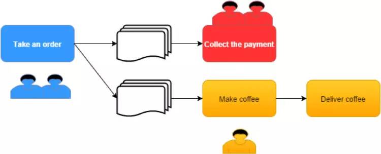 星巴克可以采取的另一种扩展方式则着眼于组织结构,意味着添加更多普通员工以通过并行方式进行饮品制作。这在软件层面即为并发处理。当一位咖啡师接到订单后,另一位接力进行筹备。这样第一位咖啡师就可以接收更多订单,各位员工之间并行不悖。