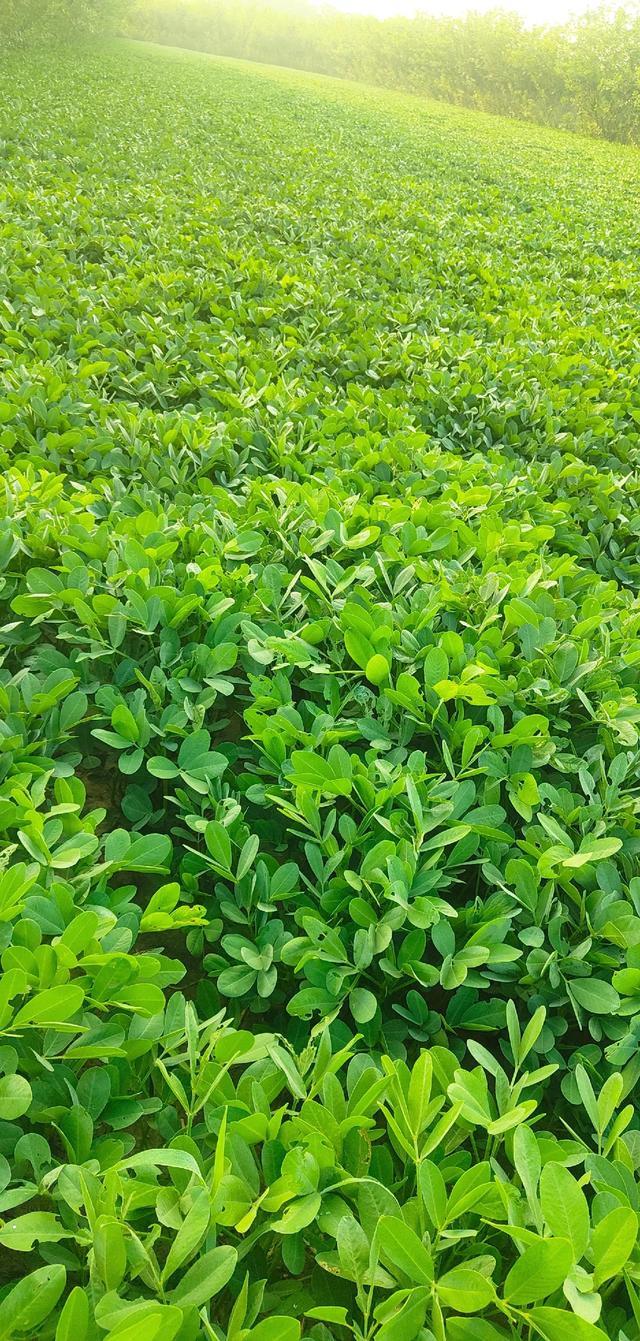花生苗破土而出后,田野便铺开了一片翠绿的画卷。椭圆形的叶片在阳光下泛着油亮的光泽,晨露凝结叶尖,宛如镶嵌的钻石。