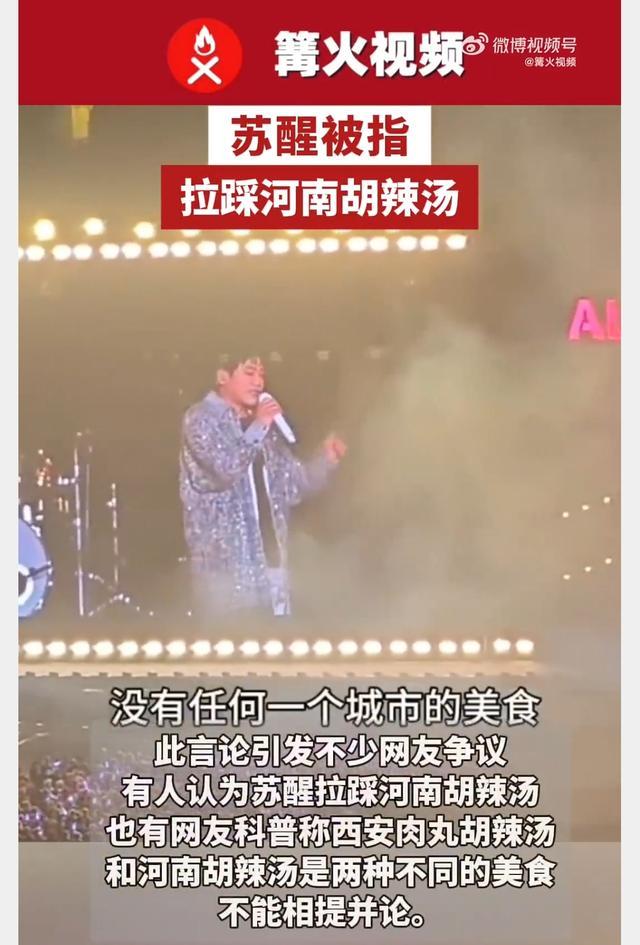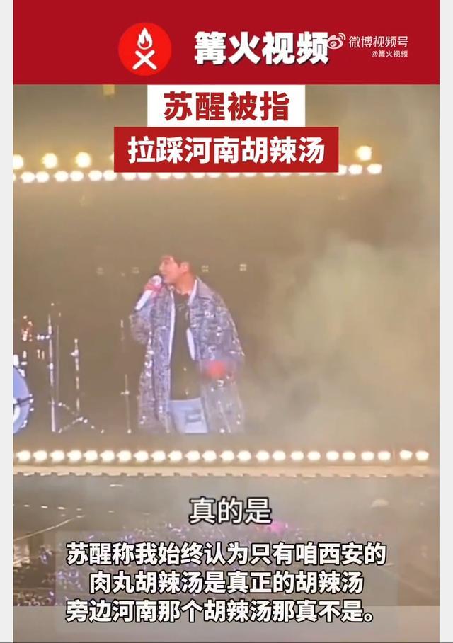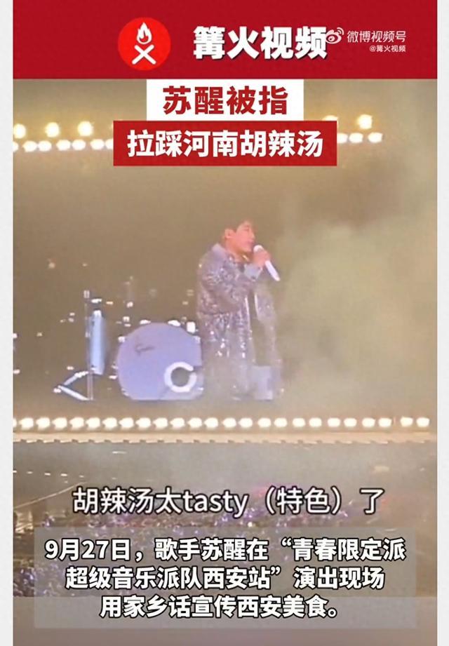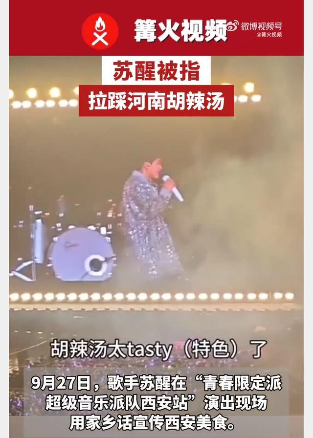 9月27日,在陕西西安举行的“青春限定派超级音乐派对”演出现场,苏醒用家乡话热情地宣传起了西安美食。他自信满满地表示:“全国各地没有任何一个城市的美食能像咱家西安的美食一样。而且我始终认为,只有咱西安的肉丸胡辣汤是真正的胡辣汤,旁边的河南胡辣汤真不是。”