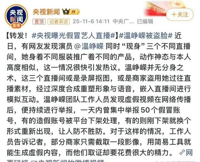 从四月起,网上至少冒出50个假冒她的AI直播账号在卖货,对此她本人都一点不知道。