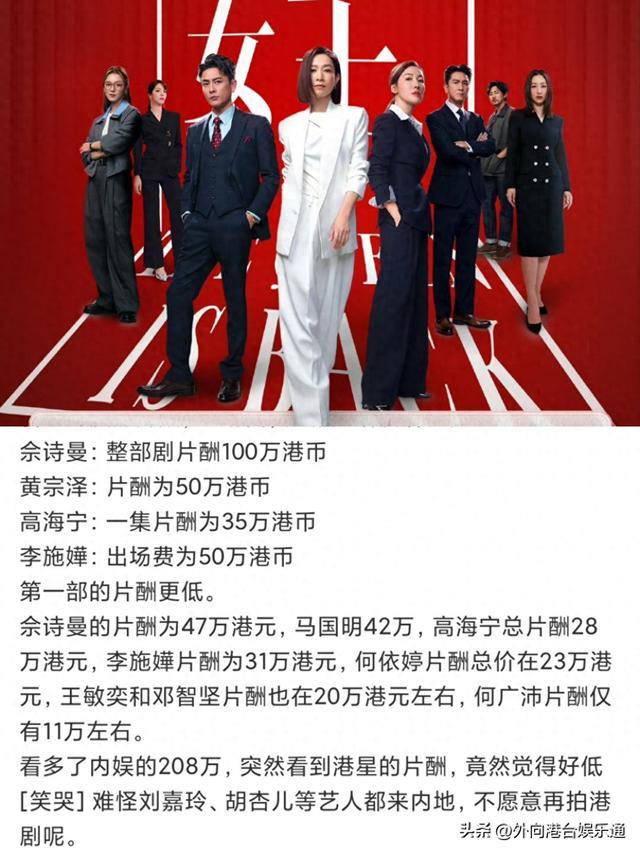 由佘诗曼、黄宗泽、马国明、李施嬅、高海宁、陈晓华等主演的TVB合拍剧《新闻女王2》近来在内地、香港热播,剧情经常掀起网络讨论,而日前,微博某娱乐博主晒出了所谓演员片酬表,其中列明女一号佘诗曼100万元,男一号黄宗泽仅50万元,引发部分网友感叹港星性价比高,不似内地演员动辄百万、千万才出演。