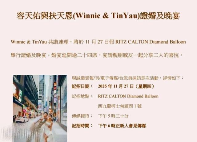 此外,原定今日在西九龙举行婚宴的TVB小生容天佑与未婚妻扶天恩取消了当晚6时接受采访的环节。