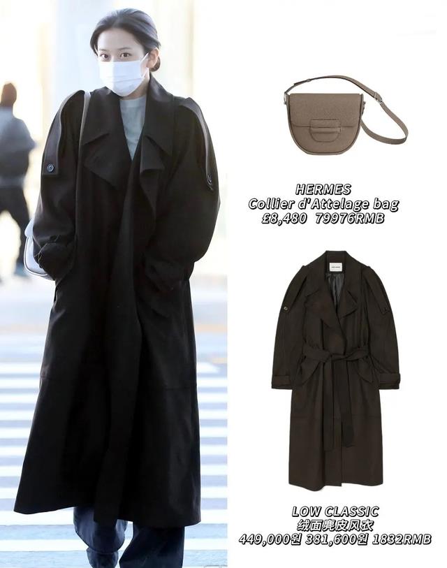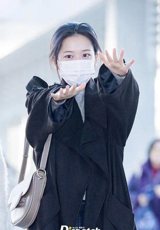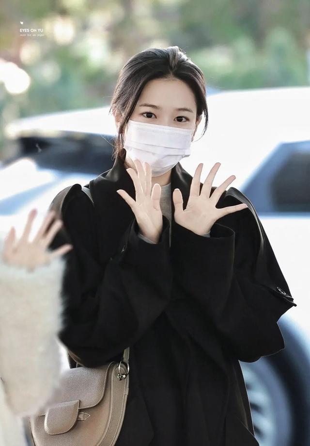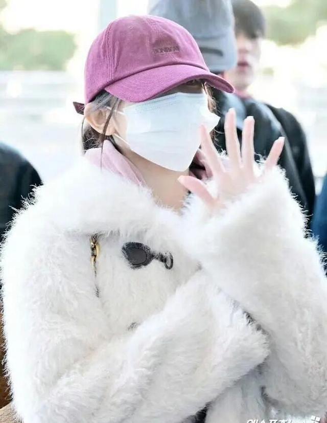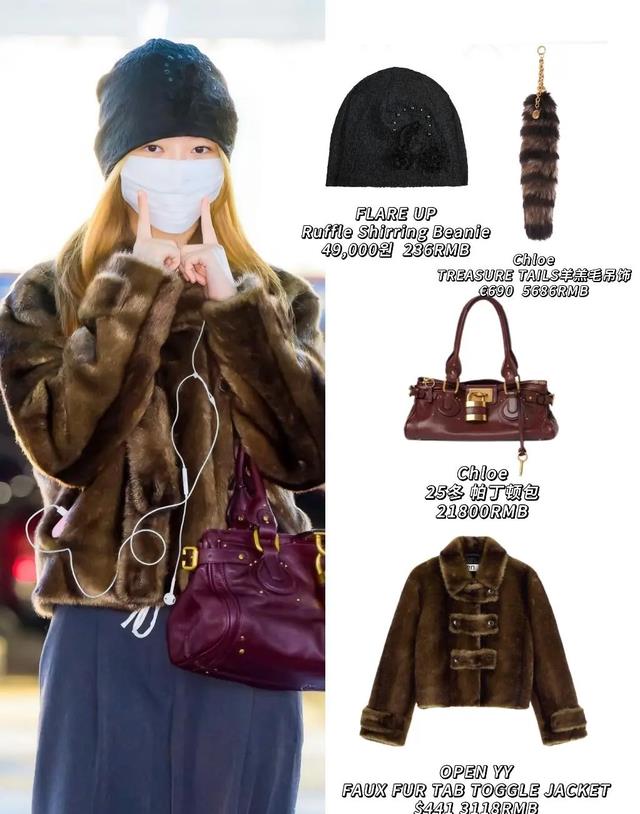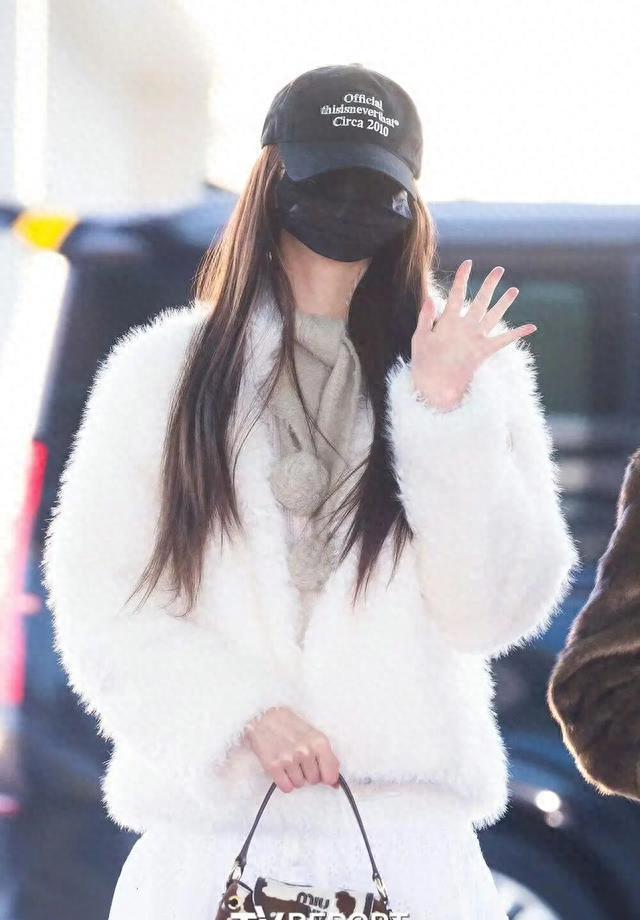 张元英在机场的出镜中,一身米色羊羔毛外套搭配同色系针织裙,看似简单的搭配,却暗藏巧思。