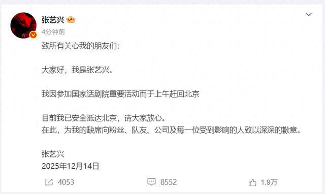 刚刚,张艺兴发文回应,称因参加国家话剧院重要活动而于上午赶回北京,现已安全抵达北京,“为我的缺席向粉丝、队友、公司及每一位受到影响的人致以深深的歉意。”