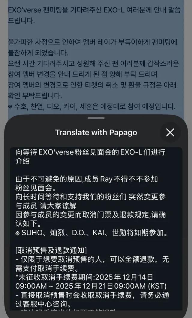 SM娱乐于韩国时间12月14日上午9点(北京时间8点)发布通知,称张艺兴因“不可避免的情况”无法参与当日下午的EXO粉丝见面会。 其余五名成员(SUHO、朴灿烈、D.O.、KAI、吴世勋)按原计划出席活动。官方开放免手续费全额退票通道,退票期限为12月14日至21日,但已入场观演的门票不可退款。