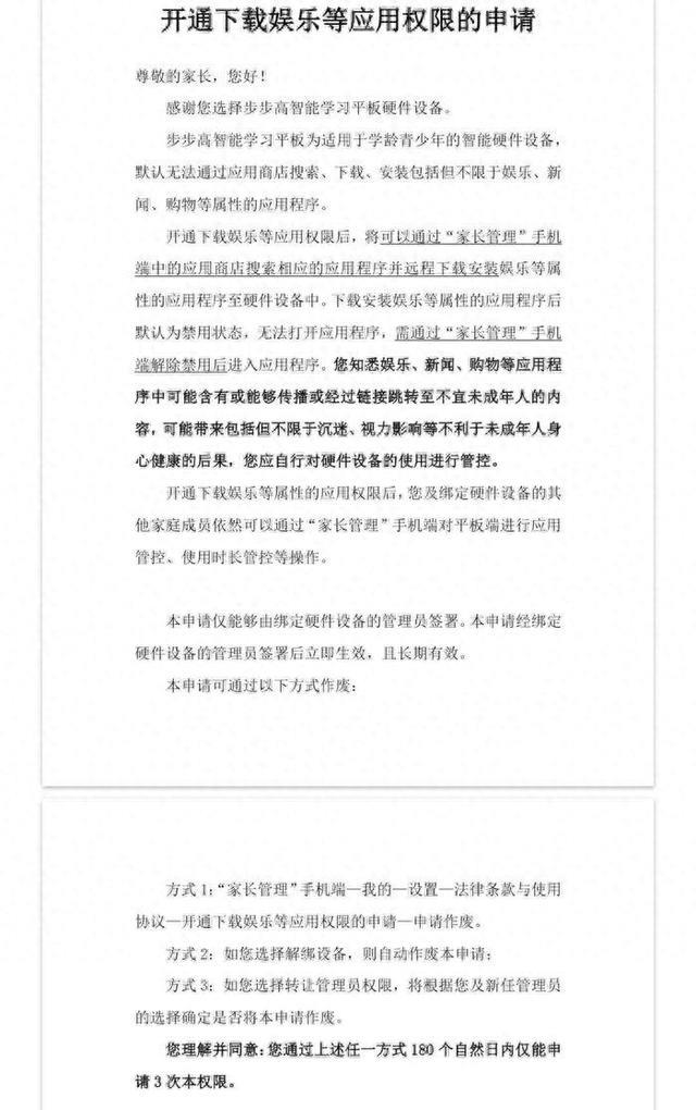 “当初购买就是看中它宣传的‘平板电脑功能的学习机’,没想到签署了权限协议还是下载不了。”杜女士回忆道,她于去年购置了步步高学习机,今年12月按学习机系统提示,提交了《开通下载娱乐等应用权限的申请》并完成签署。