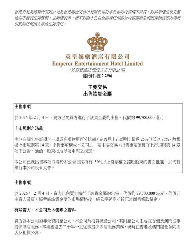2月4日晚间,英皇娱乐酒店发布公告称,于当日公司的非全资附属公司Right Achieve Limited(正成有限公司)已向买方贺利氏金属香港有限公司进行了该贵金属的出售,代价约9970万港元,而被出售的贵金属为合计重达79公斤的多块金砖。