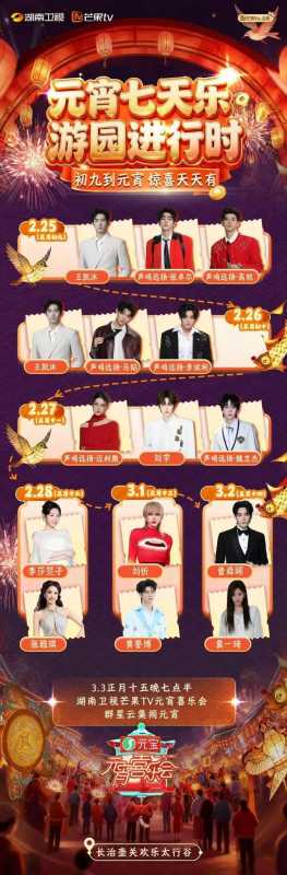 周深、周传雄、阿杜、薛凯琪、韦礼安、安崎、希林娜依高、余笛、刘赛等实力唱将集结,用多元音乐风格点亮元宵舞台;罗云熙、颜安、刘潮、王蕴凡、赵一橙等人气偶像与实力派演员齐聚,带来鲜活表演;徐志胜、牛莉、管乐、徐浩伦、谭湘文、王建华等喜剧大咖与综艺达人助阵,承包全场笑点;更有徐梦桃、王心迪冬奥冠军夫妇惊喜加盟,从雪场巅峰到元宵舞台,陪大家提灯赏月、共赴团圆之约。