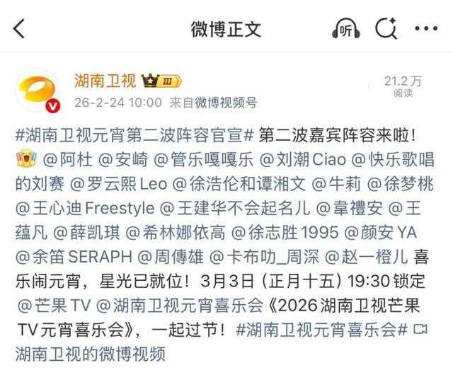 第二波嘉宾阵容星光璀璨不仅有实力唱将倾情献唱,还有奥运冠军惊喜亮相,更有演员与喜剧嘉宾齐聚,共闹元宵。